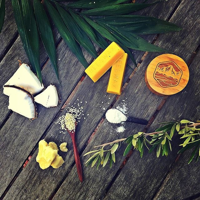 Beeswax, Carnauba Wax, Coconut Oil, Olive Oil, Sesame Oil, Shea Butter, Vitamin E. See photo in FAQ's below.
